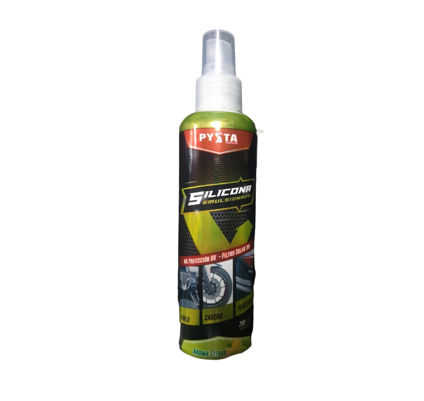 Es una silicona en spray de acción veloz. Además, actúa como acondicionador de superficies. Así, atenúa el aspecto opaco del caucho. La capa ayuda contra humedad y polvo ambiental. En consecuencia, la superficie se ensucia menos. Silicona Pysta Limpia, Brilla Spray Aroma Citrus simplifica tu rutina de detalle.